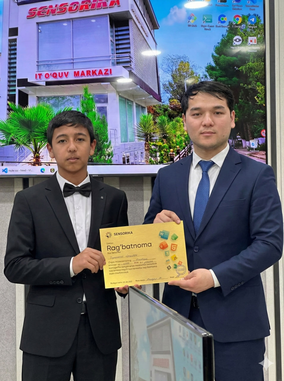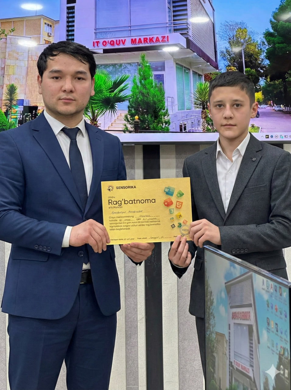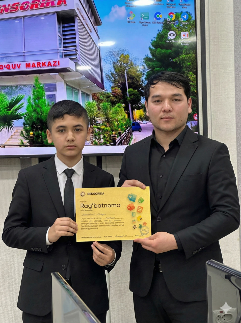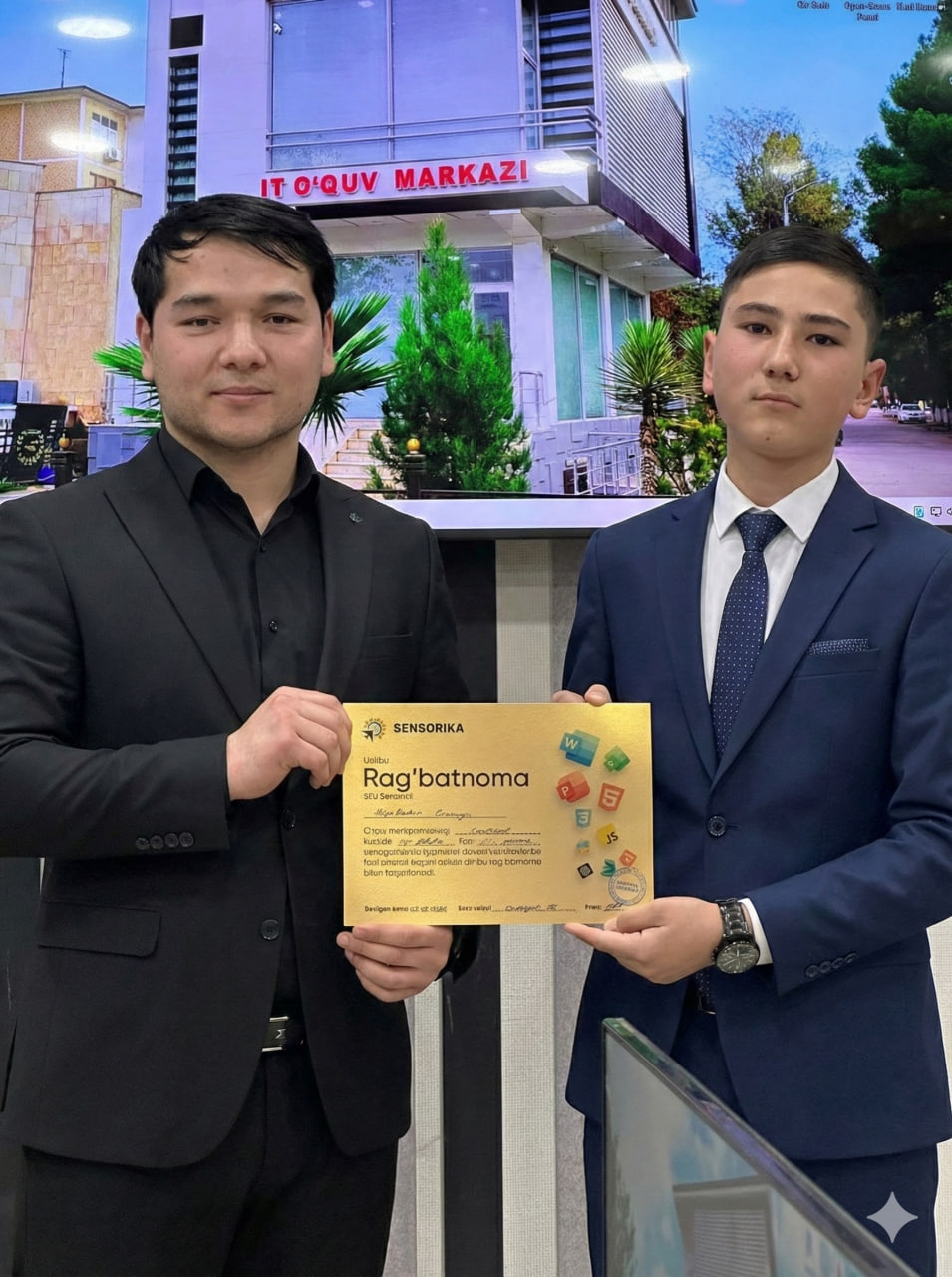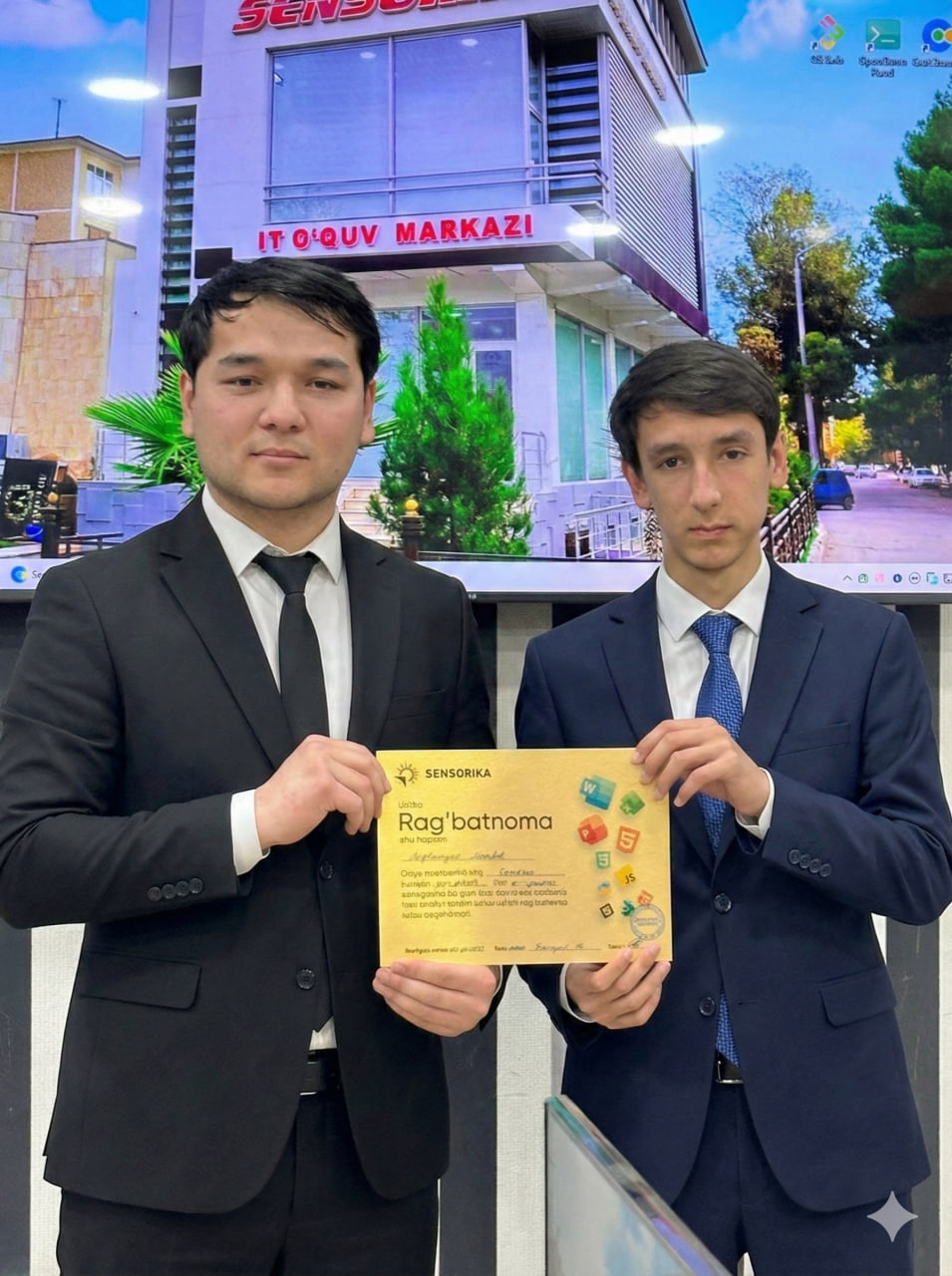 Navoiy shahridagi "SENSORIKA" IT-o‘quv markazida Frontend 59 va 61-guruh o‘quvchilari a’lo baholari uchun maxsus Rag‘batnomalar bilan taqdirlandi. Dasturlashni biz bilan o‘rganing!