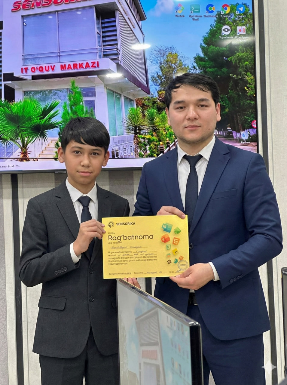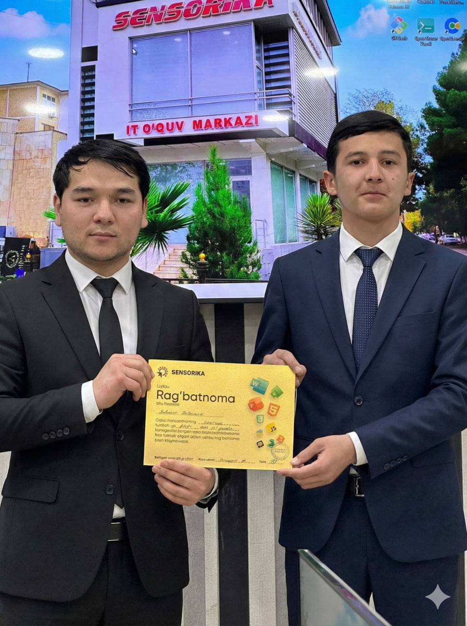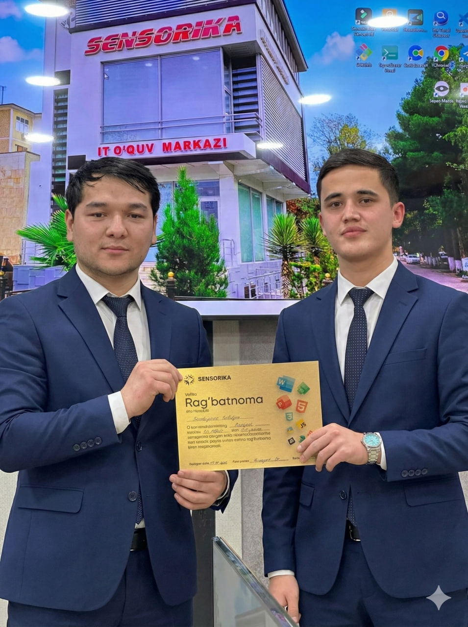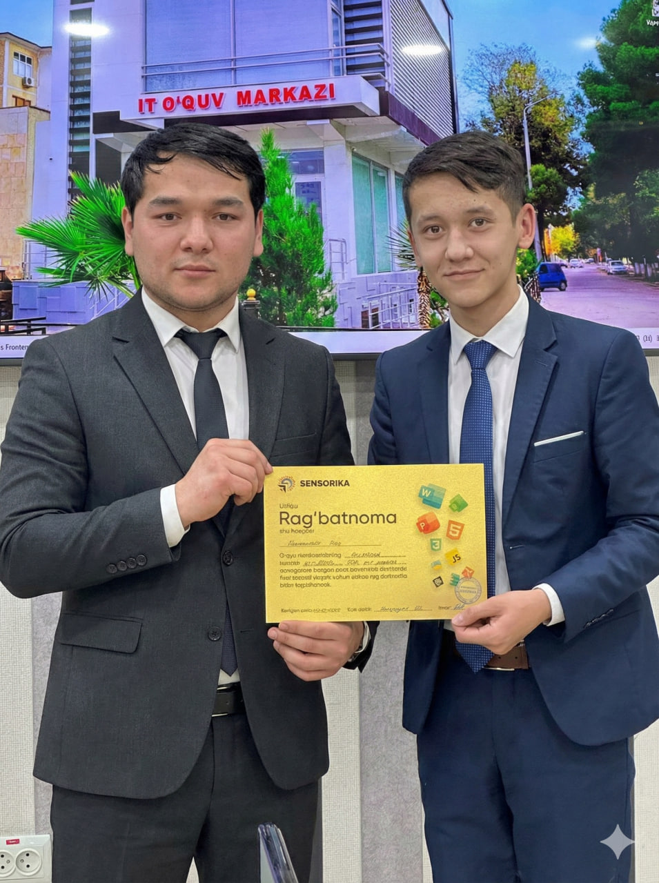 Navoiy shahridagi "SENSORIKA" IT-o‘quv markazida Frontend 59 va 61-guruh o‘quvchilari a’lo baholari uchun maxsus Rag‘batnomalar bilan taqdirlandi. Dasturlashni biz bilan o‘rganing!