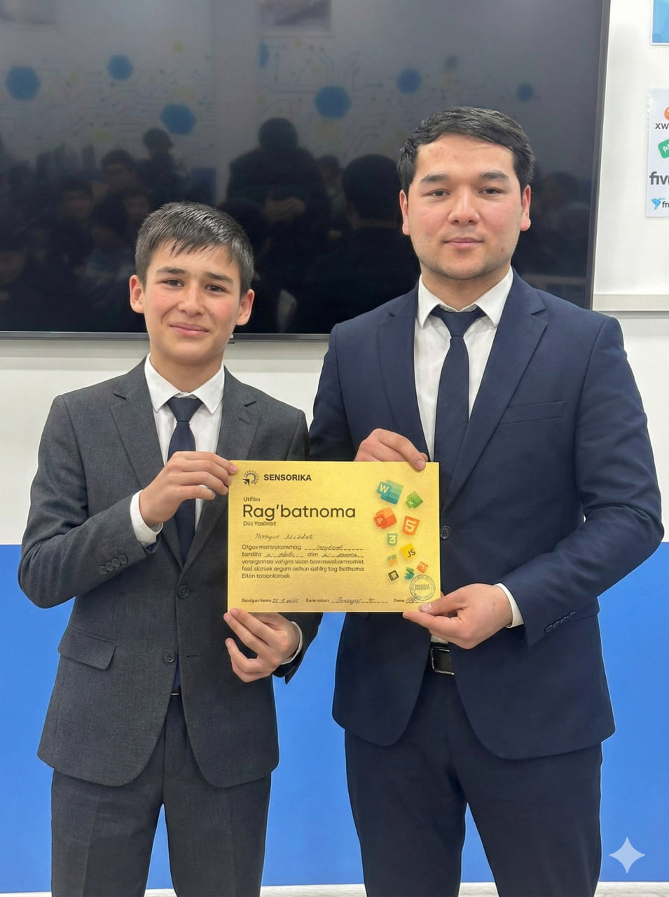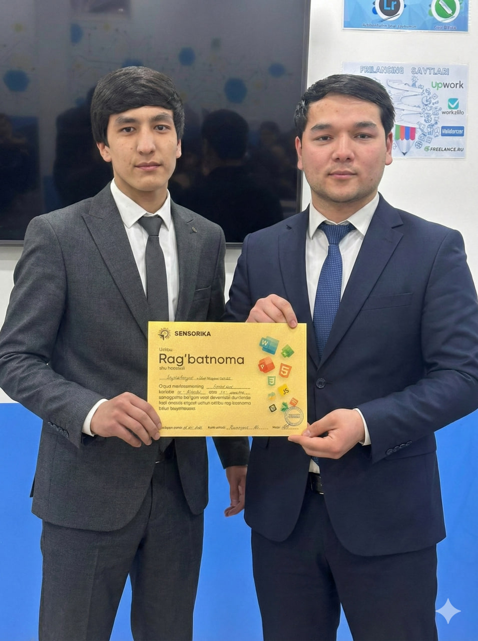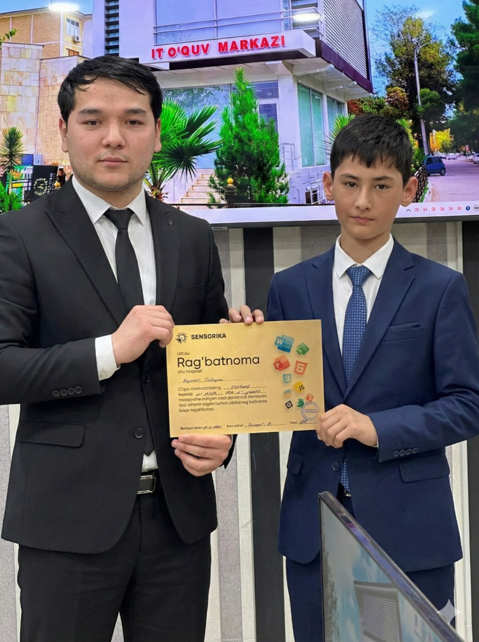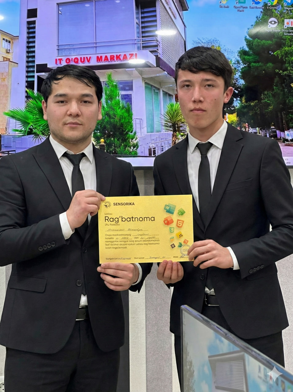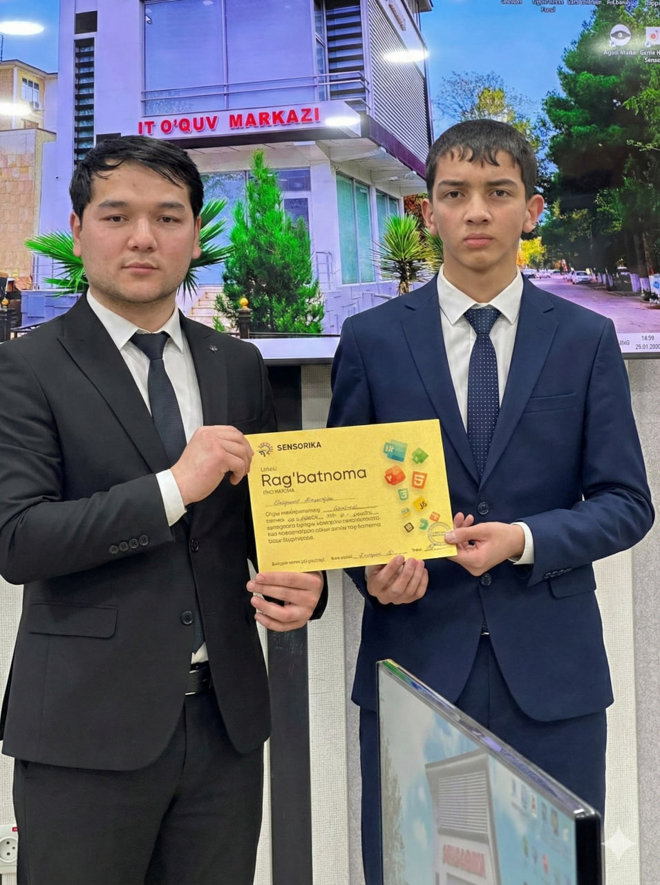 Navoiy shahridagi "SENSORIKA" IT-o‘quv markazida Frontend 59 va 61-guruh o‘quvchilari a’lo baholari uchun maxsus Rag‘batnomalar bilan taqdirlandi. Dasturlashni biz bilan o‘rganing!