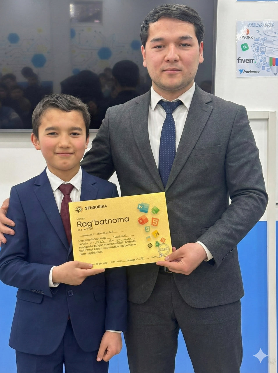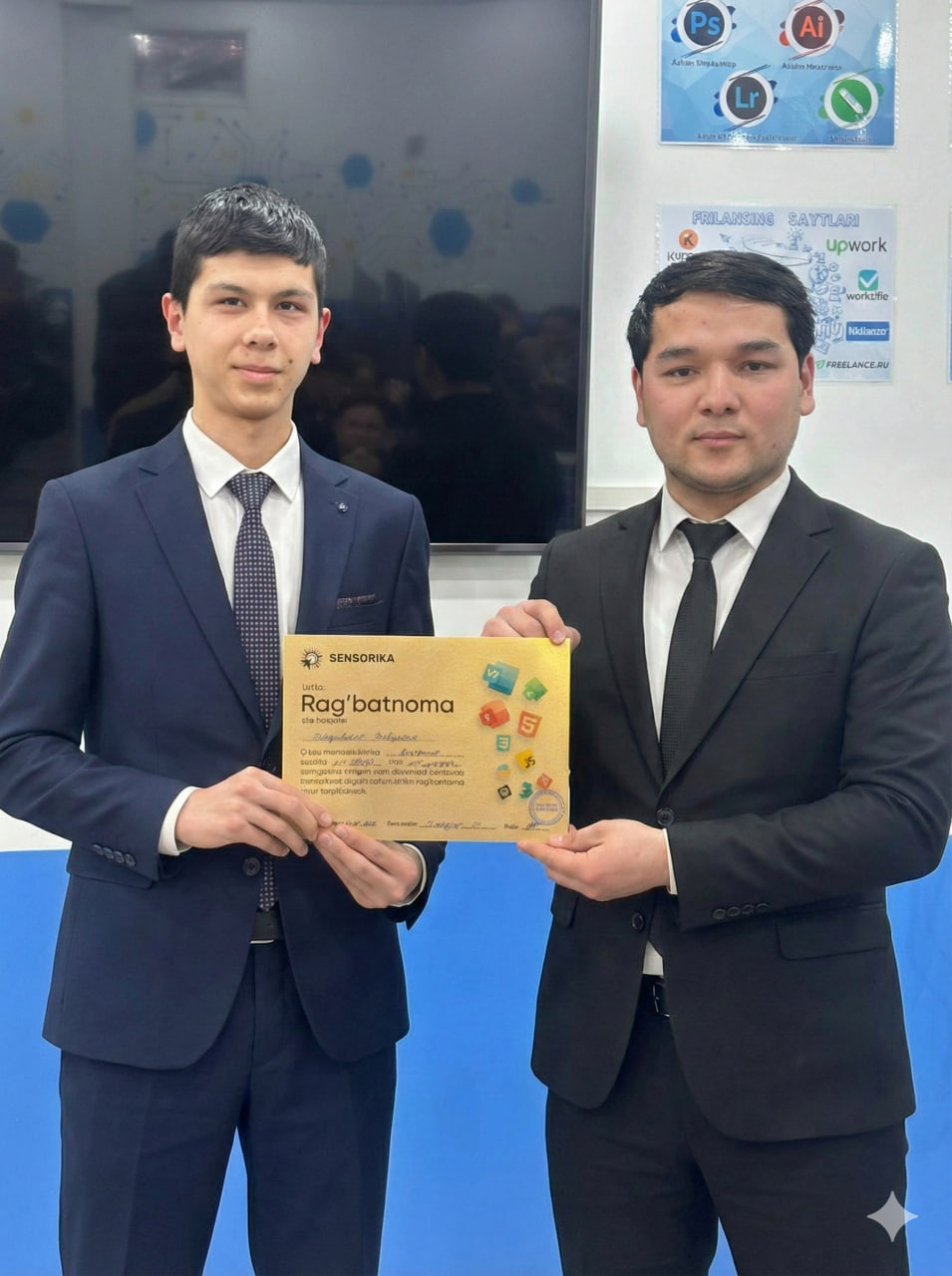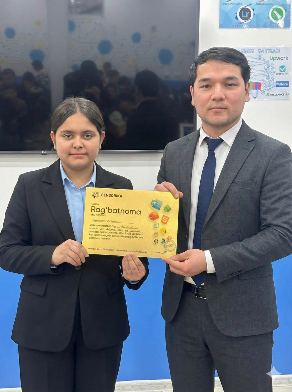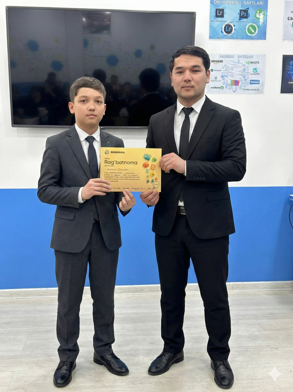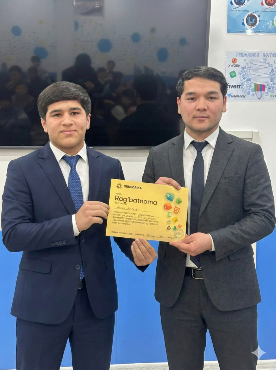 Navoiy shahridagi "SENSORIKA" IT-o‘quv markazida Frontend 59 va 61-guruh o‘quvchilari a’lo baholari uchun maxsus Rag‘batnomalar bilan taqdirlandi. Dasturlashni biz bilan o‘rganing!