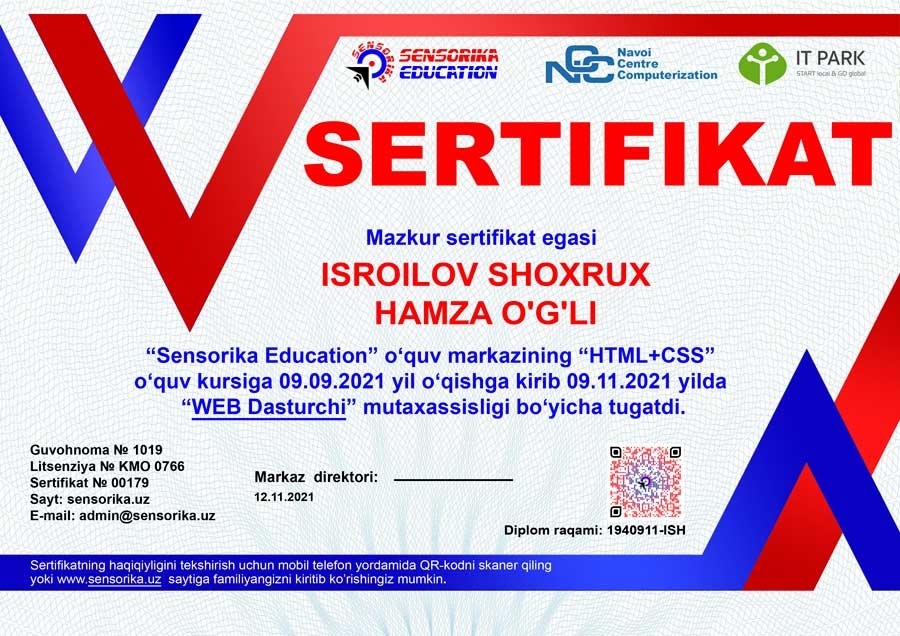Sertifikat raqami: 1940911-ISH