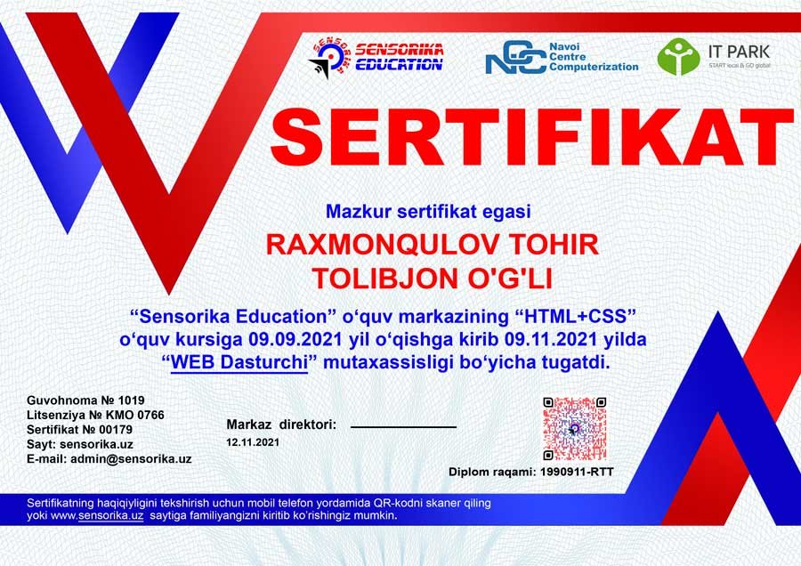 Sertifikat raqami: 1990911-RTT