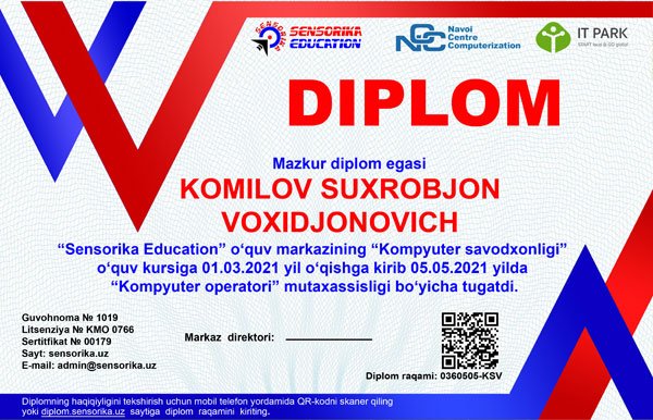 Sertifikat raqami: 0360505-KSV