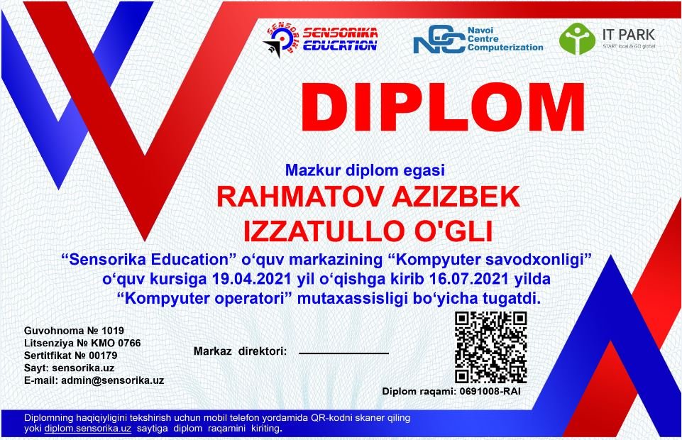 Sertifikat raqami: 0691008-RAI