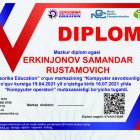 16.07.2021-yilda “Kompyuter savodxonligi” o‘quv kursini to‘liq tugatib onlayn test sinovlarini muvaffaqiyatli topshirdi.