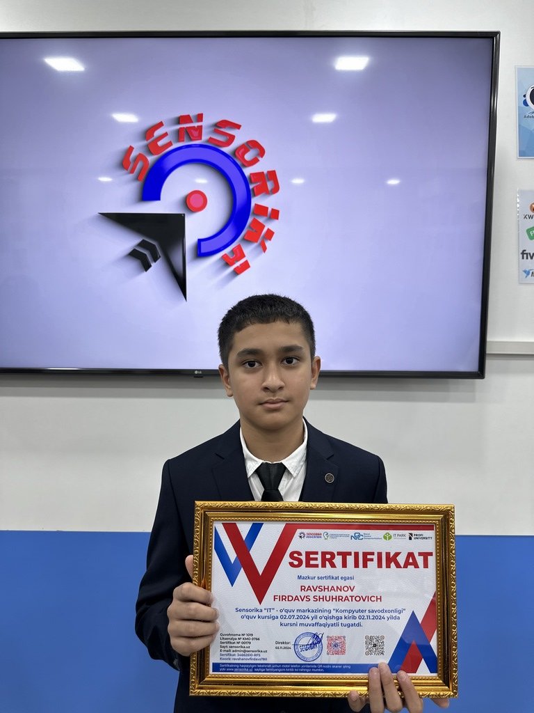Do'stim, dasturlash dunyosida ko'rsatgan aqling, mehnating va yutuqlaring bilan bizni hayratda qoldirding! Bu sertifikat faqat boshlang'ich, chunki seni yanada katta muvaffaqiyatlar kutmoqda. Tabriklaymiz, dasturchi tigit!