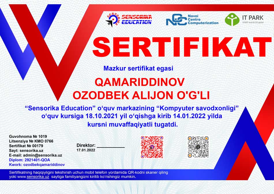 Sertifikat raqami: 2921401-QOA