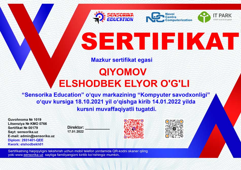 Sertifikat raqami: 2931401-QEE