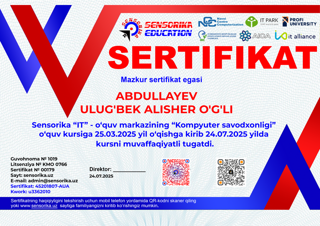 Sertifikat raqami: 45201807-AUA