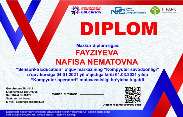 Sertifikat raqami: 0040103-FNN