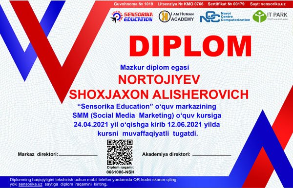 “Sensorika Education” o‘quv markazining SMM (Social Media Marketing) o‘quv kursiga 24.04.2021 yil o‘qishga kirib 12.06.2021 yilda kursni muvaffaqiyatli tugatdi.